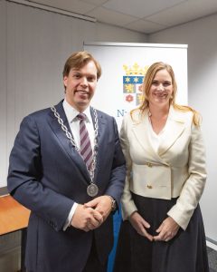 Nadat de bijzondere vergadering geopend was door tijdelijk voorzitter Monique Donkers en het benoemingsbesluit was voorgelezen, ging de commissaris van de Koning, Ida Adema over tot het officiële gedeelte. Er volgde een mooie speech, waarin ze de kenmerken van de nieuwe burgemeester, samengevat in de drie G’s van Genugten: geluk, gastvrijheid en gemeenschap, combineerde met de drie N’s van Nuenen: nuchterheid, nabijheid en nieuwsgierigheid. Ze voegde er nog een vierde G aan toe; die van geestigheid, niet te verwarren met geestelijkheid, maar als in een gezonde dosis humor. Al met al dé eigenschappen die een burgemeester van een dwèrse gemeente in Brabant nodig heeft om de baan voor langere tijd tot een succes te maken.